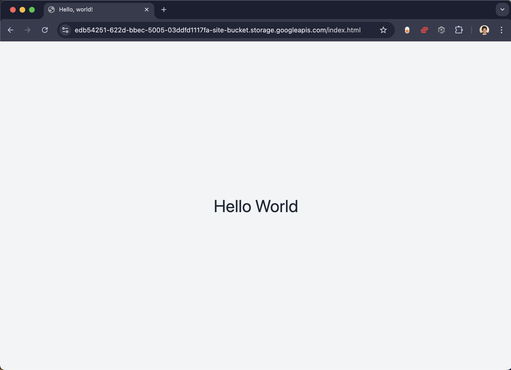 To view the site content, I’ll navigate to the URL of the bucket in my browser. The URL is in the format https://<bucket-name>.storage.googleapis.com. In this case, the bucket name is be028675-b3cd-8fbd-c48a-3ddb6629ca7b-site-bucket, so the URL is https://be028675-b3cd-8fbd-c48a-3ddb6629ca7b-site-bucket.storage.googleapis.com/index.html.